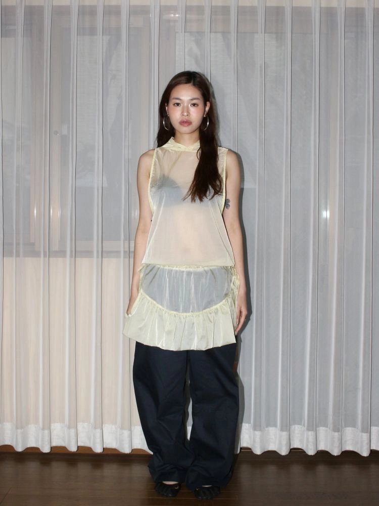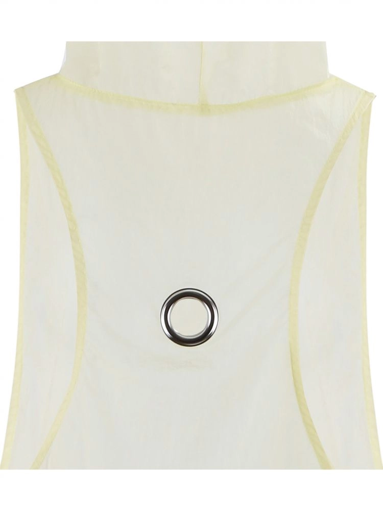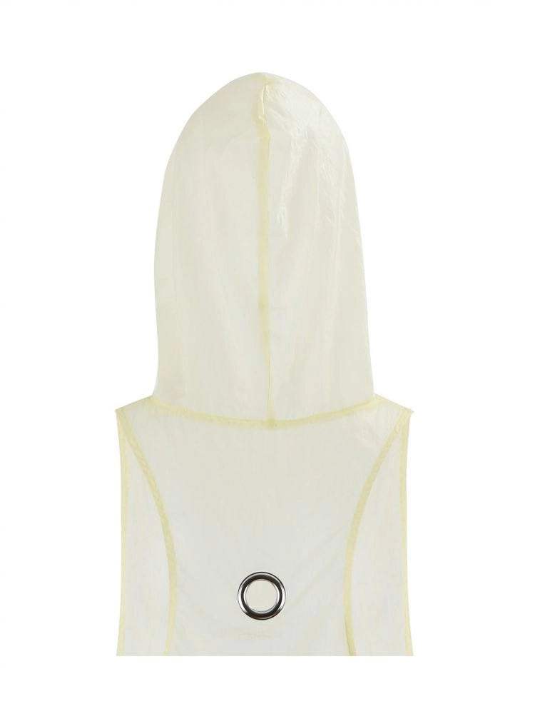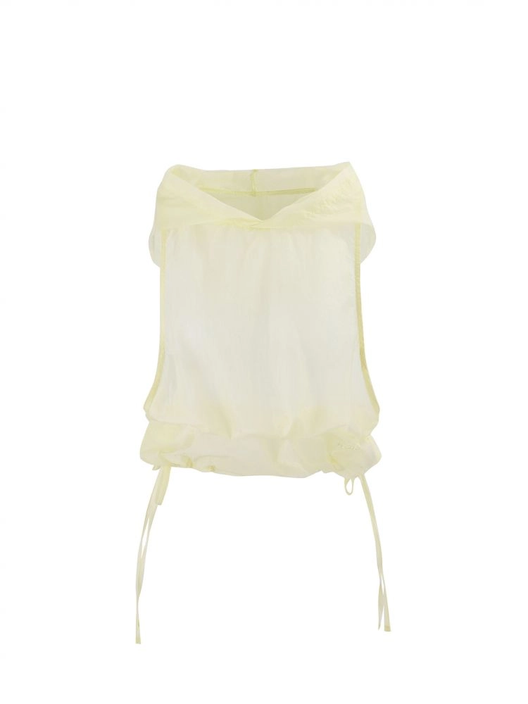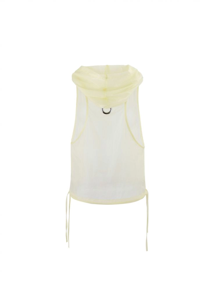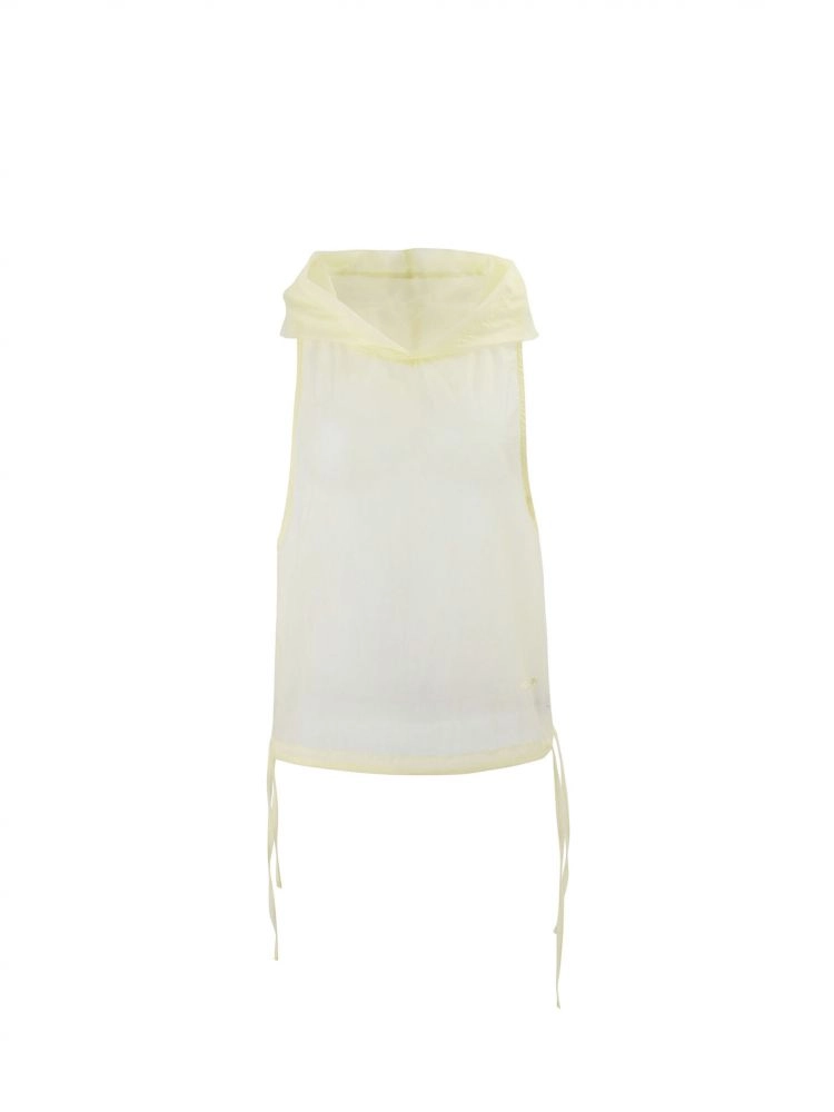 A summer hooded vest crafted from bright yarn fabric with a subtle pearlescent glow.