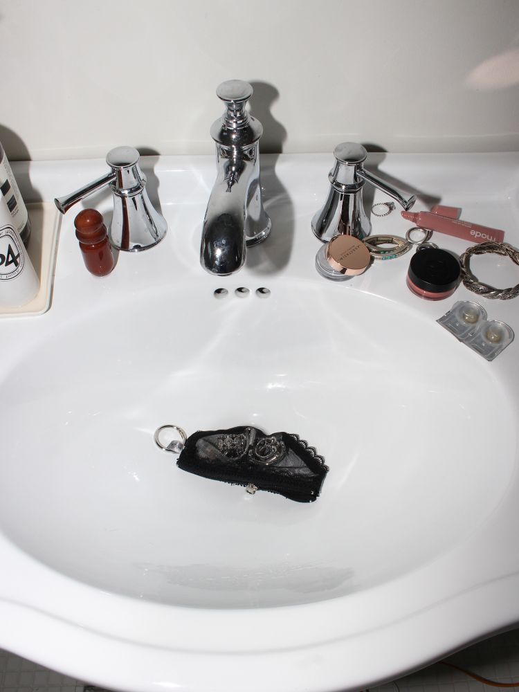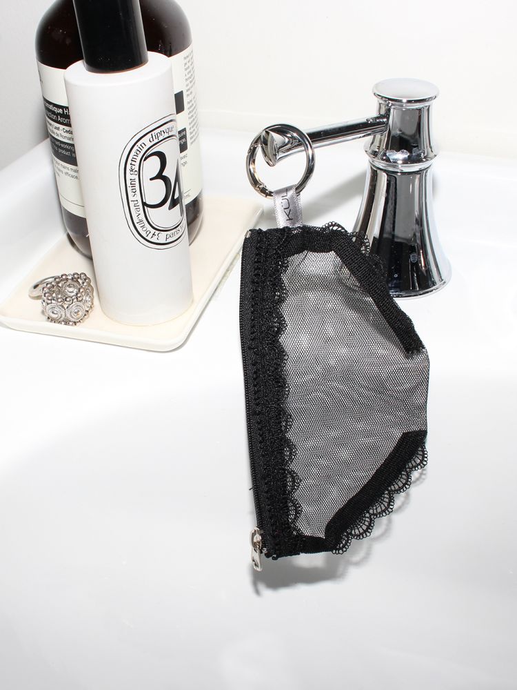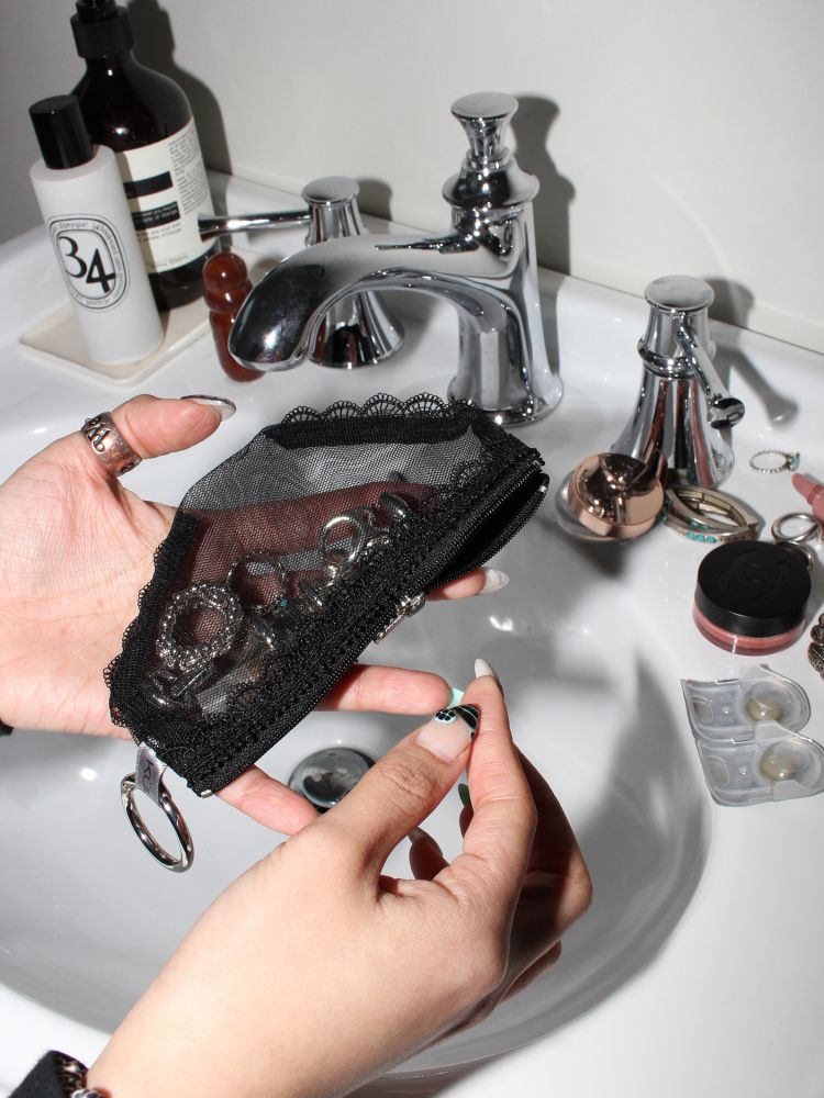 A lace-trimmed Cheeky pouch designed for your small essentials.